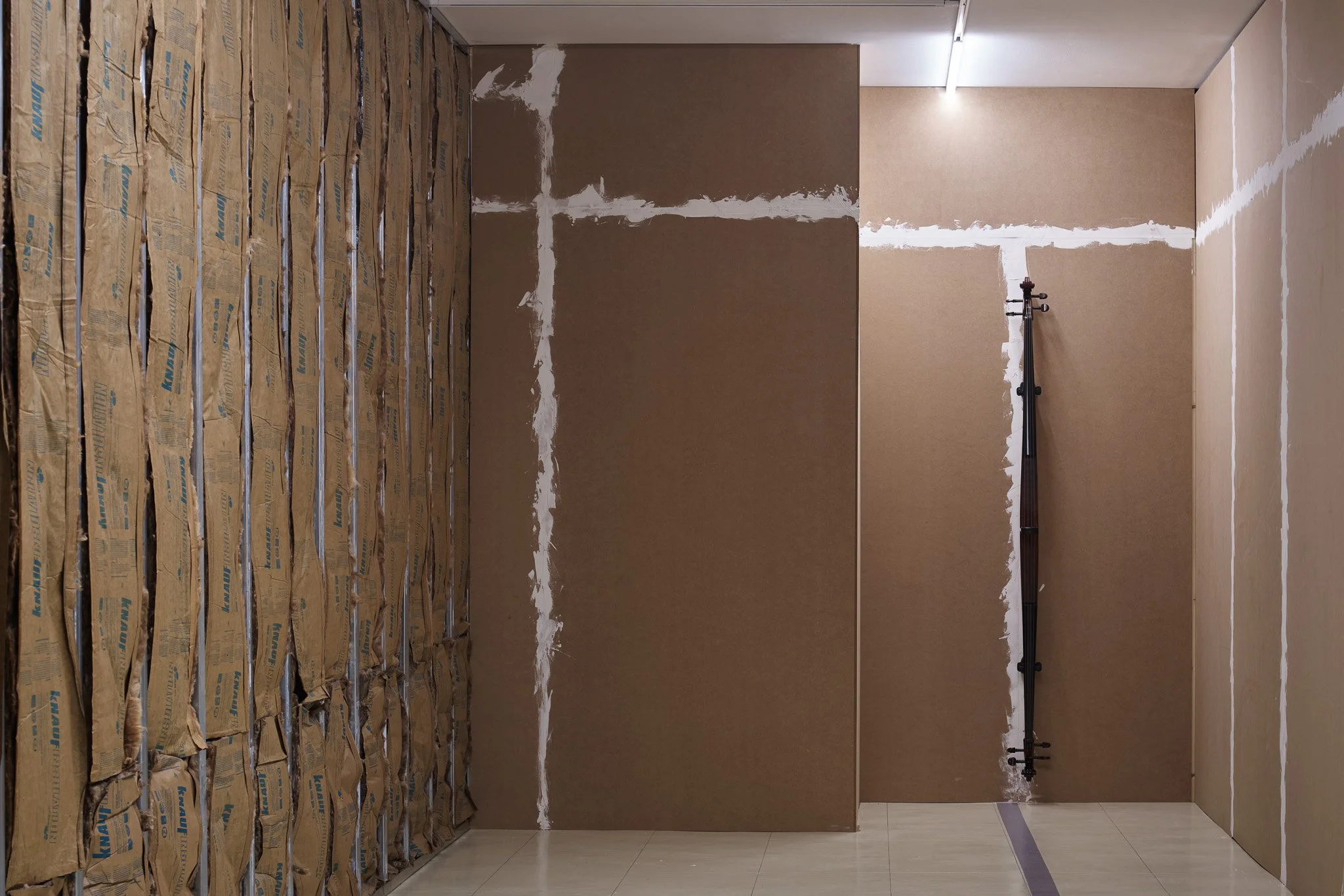 The exhibition contains the time, devices, and stage of those preparing for an indeterminable future. Teeming with coarse sensation, this is a zone that deals with temporalities preceding the blow— the auditory ‘boom.’ While one remains in the purgatory of rehearsal, another meticulously primes an instrument like a well-honed weapon. When, where, and how the performance will unfold remains opaque, yet what’s clear is that a stage exists. In this space of sound and sound-makers, where we expect to hear, we read the flow of sonic words as we listen to concrete sounds.